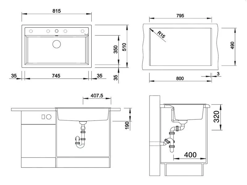 - dimensioni totali del lavello: 815 x 510 mm