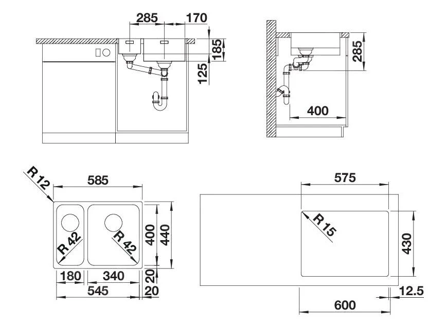 - dimensioni del lavello più piccolo: 180 x 400 x 125 mm (lunghezza x larghezza x profondità)