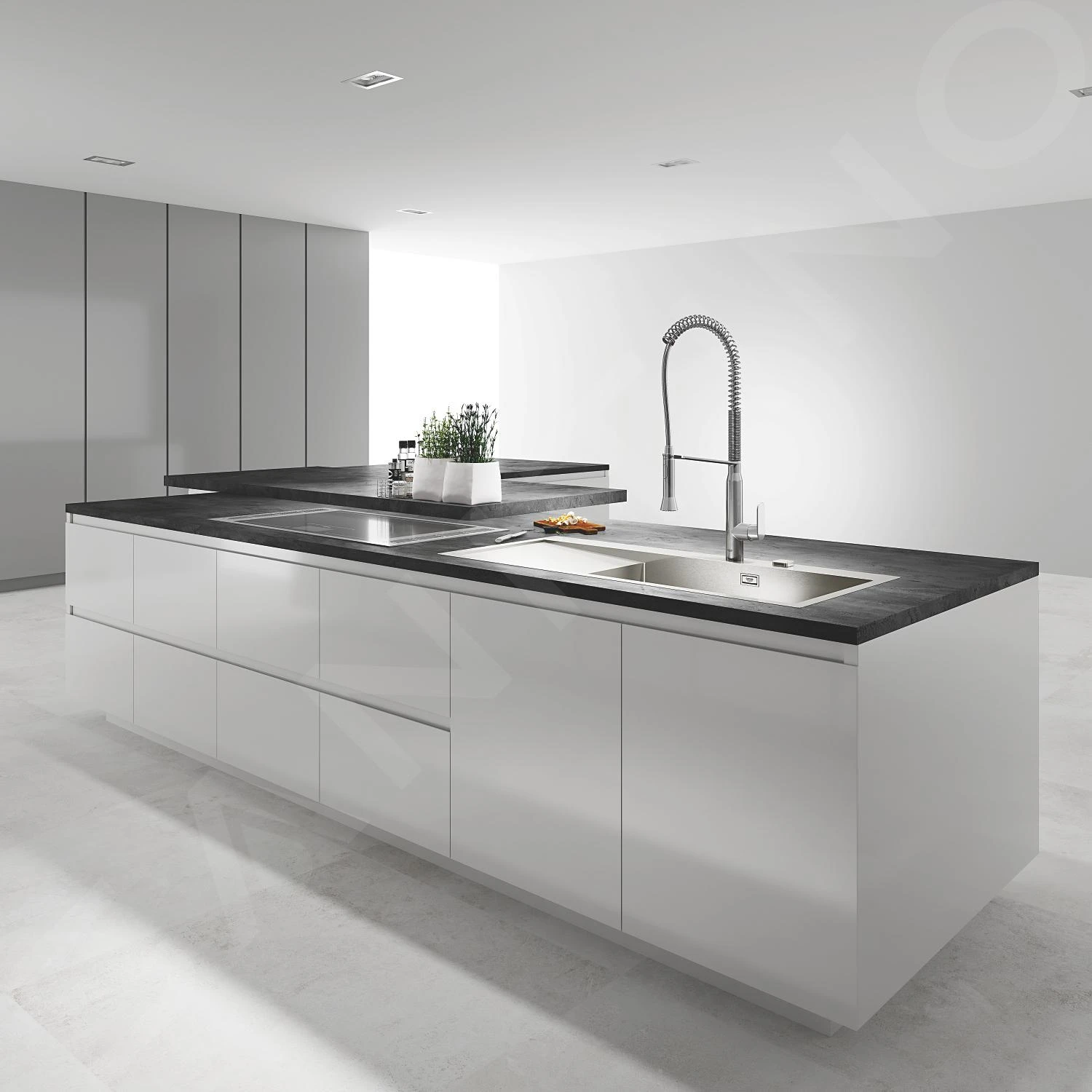 La piletta a U alta e girevole consente di lavorare facilmente nello spazio del lavello. Allo stesso tempo, potrete riempire facilmente contenitori alti o ingombranti. La doccia professionale in metallo vi delizierá con due getti d’acqua: un getto doccia SpeedClean delicato e uno intenso. Il miscelatore per lavello é dotato di un limitatore di flusso regolabile in modo variabile. Grazie a questo avrete sotto controllo il consumo di acqua. Fatevi aiutare dai professionisti nella vostra cucina.